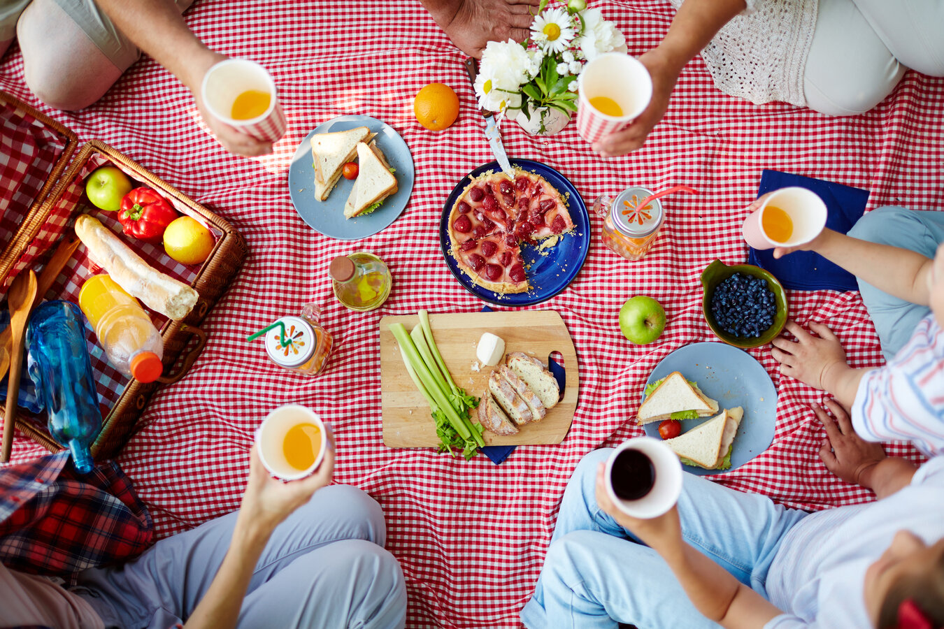 Family picnic with cake and fruits